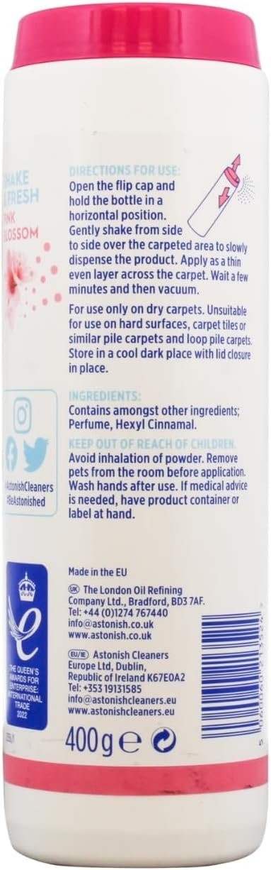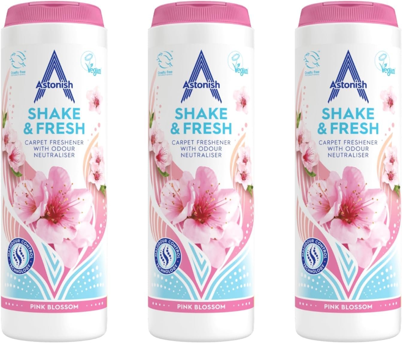 Refresh your home with the Astonish Shake & Fresh Carpet Freshener, a convenient 3-pack designed to effortlessly eliminate pet, musty, and stale odours from your carpets. Simply shake, wait, and vacuum to leave your floors revitalized with a delightful pink blossom scent. This easy-to-use solution from the Astonish Store keeps your space smelling inviting and ensures you’re always ready to tackle odours. Stock up and enjoy long-lasting freshness with this must-have carpet care essential.