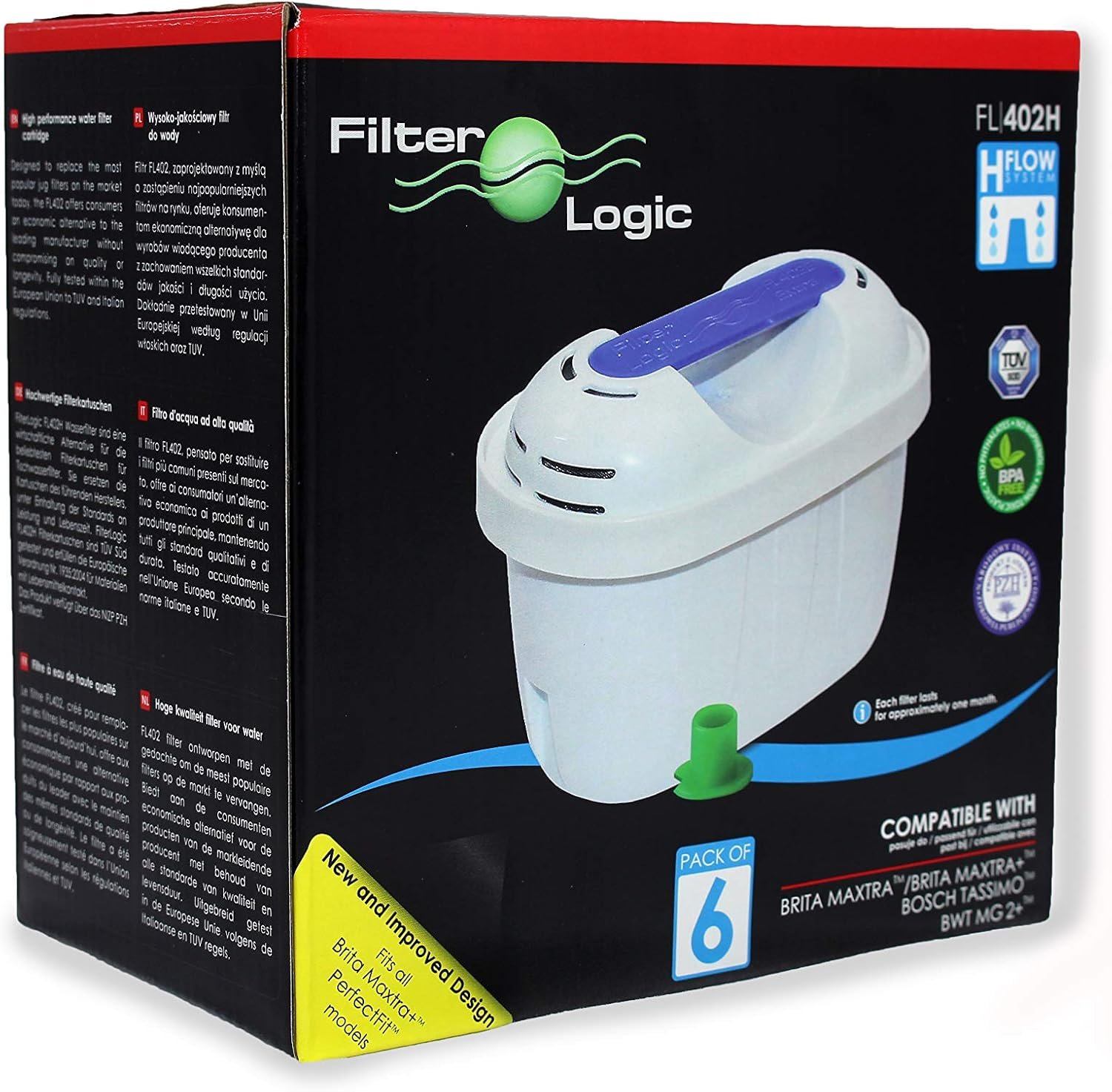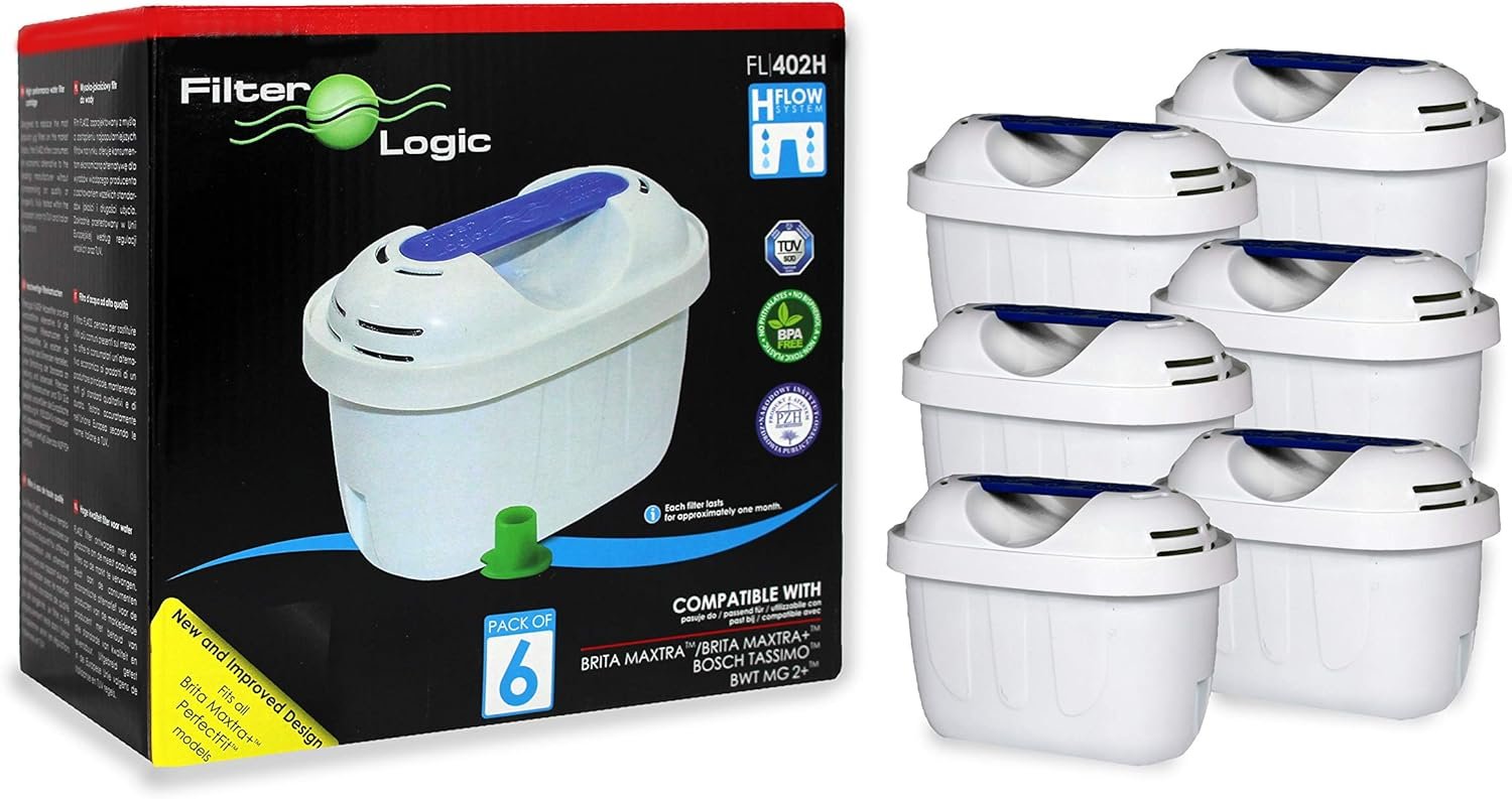 Experience cleaner, better-tasting beverages with the FilterLogic Universal 6 Pack Filter Cartridges, designed to fit seamlessly into Brita Maxtra & Plus+ water jugs, including Marella, Elemaris, Bosch Tassimo, and kettles. These filters, certified by TUV to European/German standards, effectively reduce limescale and eliminate scum in your hot drinks while a carbon stage removes chlorine for improved taste and odor. As the only compatible filter for Maxtra, Maxtra+, and Maxtra PerfectFit, this is an essential upgrade for any household looking for reliable water filtration from FilterLogic.